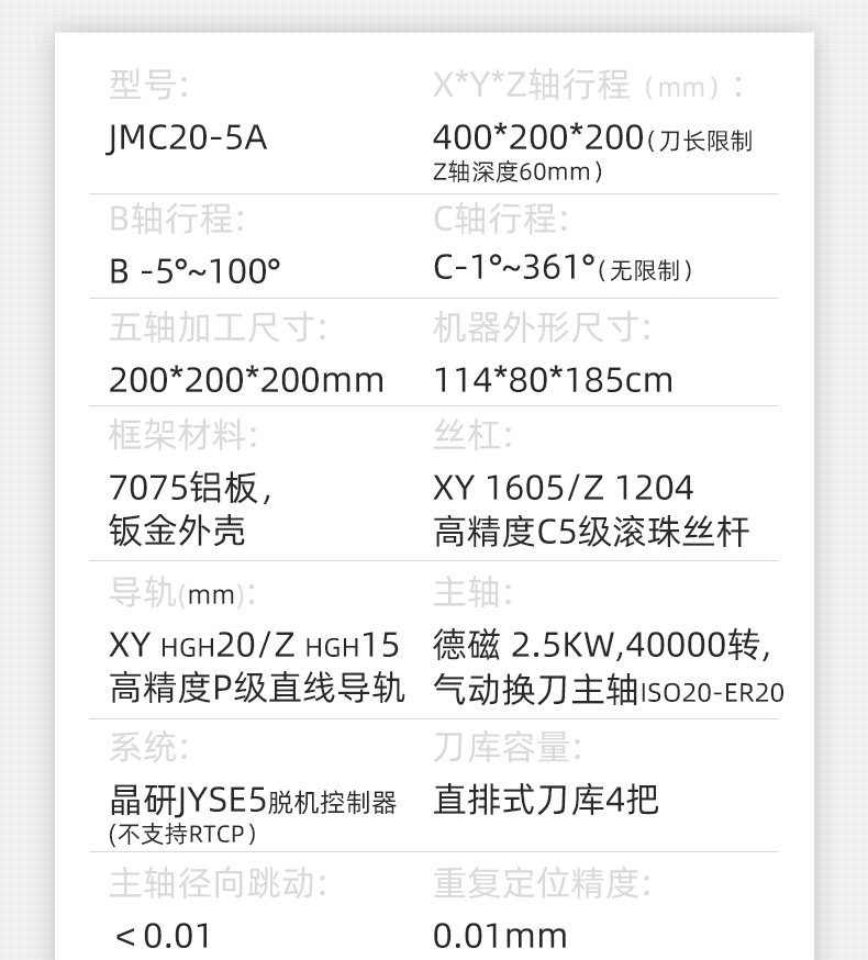 500505百万文字论坛转载各坛-500505百万论坛最新更新内容-500608百万文字论坛白手起家-新500507百万文字论坛-500505百万文字论坛-500505百万文字论坛-百万文字转载各坛论文500608BC摇篮五轴精雕机,2.5KW气动换刀主轴,4把直排刀库,配备精密滚珠丝杆和直线导轨,运行顺滑稳定。采用进口松下伺服电机,BC两轴谐波减速机,精度高。JYSE5控制系统支持5轴联动,操作简单。大行程加工区域,B轴-5°~100°,C轴360°,五轴200×200×200mm三维加工尺寸,满足复杂镂空及五金零件加工需求。