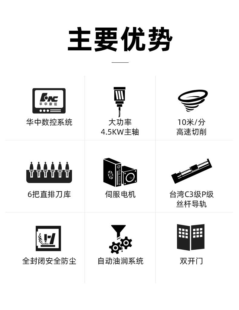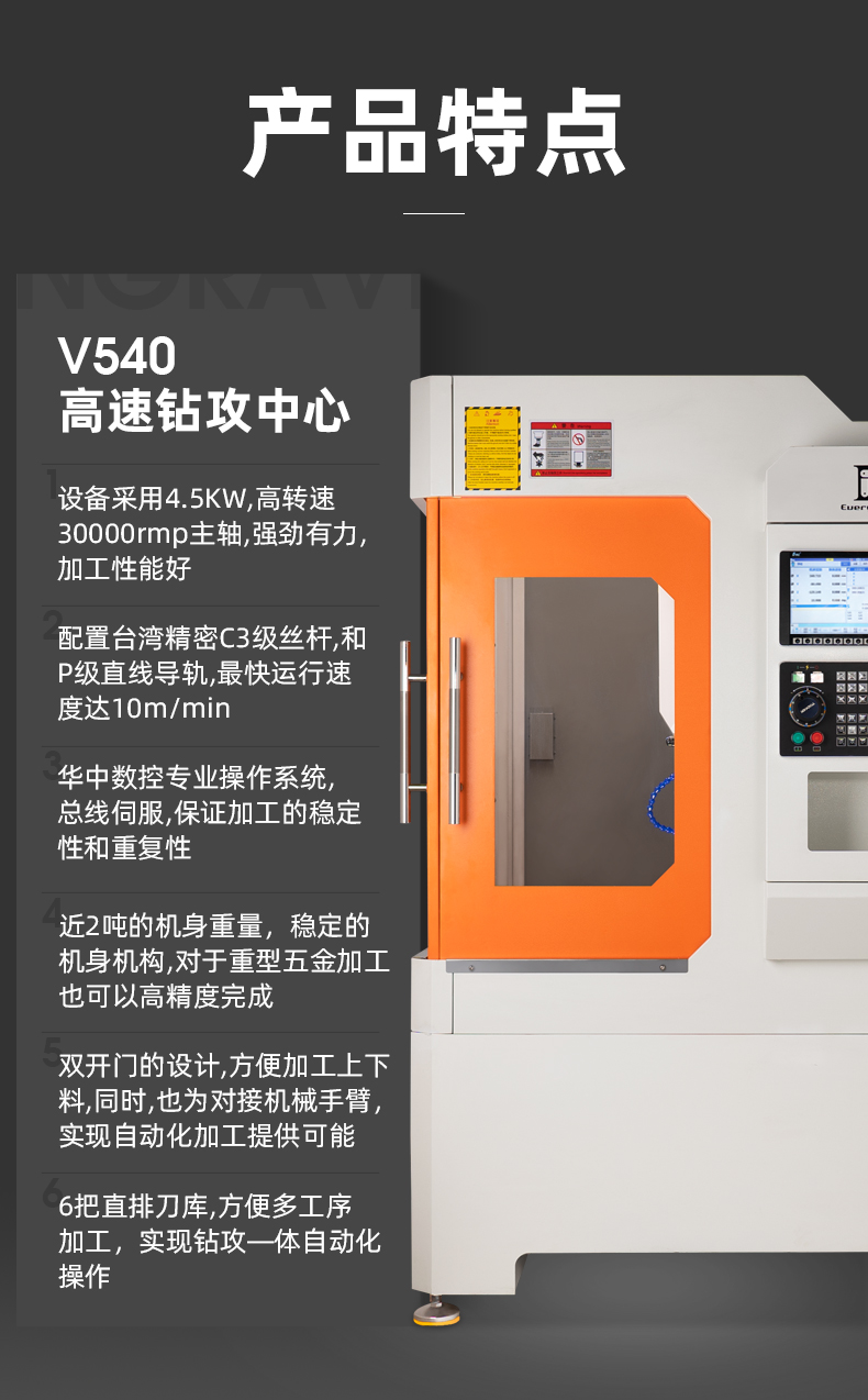 500505百万文字论坛转载各坛-500505百万论坛最新更新内容-500608百万文字论坛白手起家-新500507百万文字论坛-500505百万文字论坛-500505百万文字论坛-百万文字转载各坛论文500608V540高速钻攻中心,采用4.5KW、30000rmp高转速主轴,强劲有力,加工性能佳。配置台湾C3级丝杆和P级直线导轨,最快运行速度达10m/min。搭载华中数控专业操作系统,总线伺服,确保加工稳定性和重复性。机身重近2吨,结构稳定,适配重型五金高精度加工。双开门设计,便于上下料及对接机械手臂实现自动化。6把直排刀库,支持钻攻一体自动化操作。