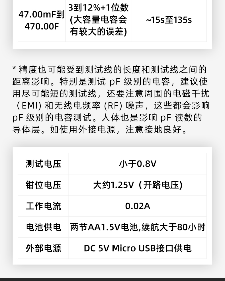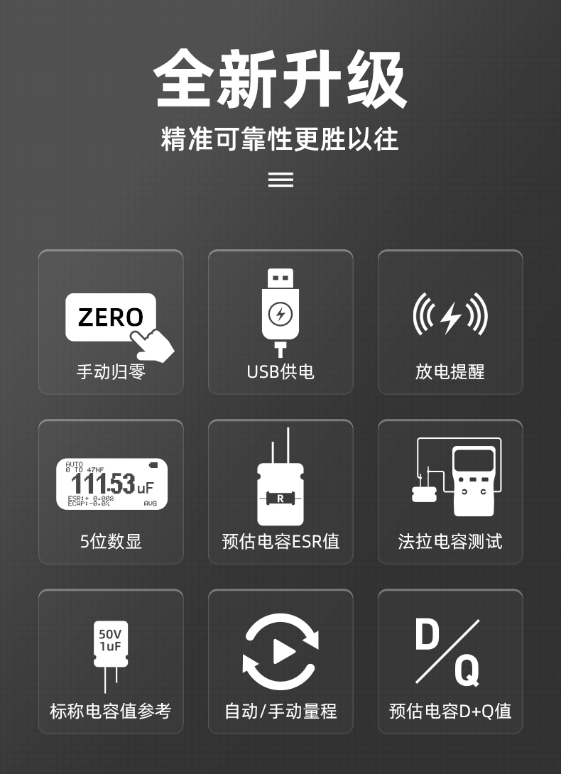 高精度1%,自动量程,超宽量程测试,AVG滑动平均功能,读取数值更加精准,一键清零按钮,方便更加稳定,减少误差,自动关机功能,节省电量。