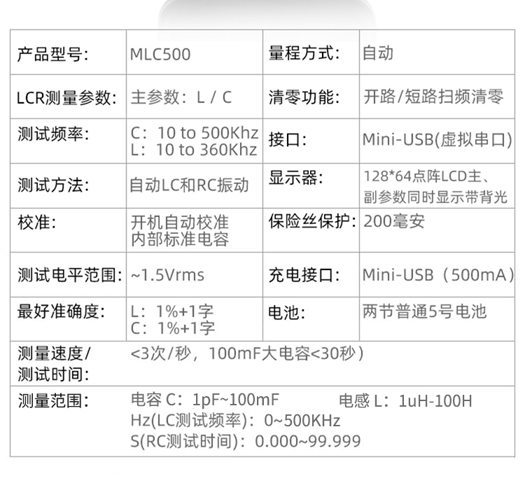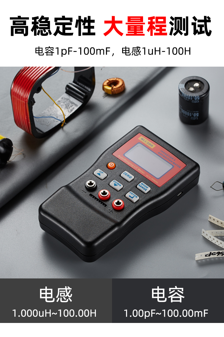 厂家直销,高精度电容电感表MLC500,高频测试,电容500kHz,电感360kHz,性价比超值,对于家电维修,DIY爱好设计,小元件测试都是非常不错的,测试速度快,精度灵敏,绝对是您的不错之选!另配上位机软件,连接电脑,便于专业工程人员对数据研究分析,物超所值啦!您还在等什么?!