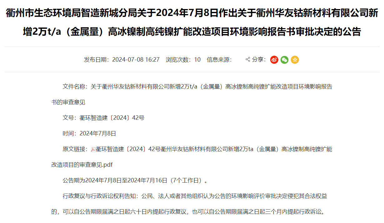 华友钴新材料新增2万t/a高冰镍制高纯镍扩能改造项目环评获审批